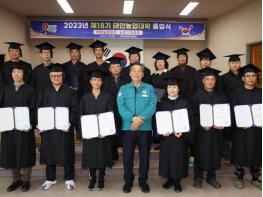 군은 지난 23일 태안군농업기술센터 대강당에서 가세로 군수 등 군 관계자와 졸업생 59명 등 70여 명이 참석한 가운데 ‘2023년 제18기 태안농업대학 졸업식’을 갖고 신규 농업인들의 미래를 응원하는 시간을 마련했다고 밝혔다.