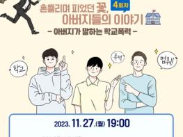 이번 공감 토크는 ‘흔들리며 피었던 꽃, 아버지들의 이야기’를 주제로 ▲아버지들이 경험한 학교폭력 ▲아버지들이 바라보는 요즘 학교와 학교폭력 ▲아버지가 말하는 학교폭력 해결 방법 ▲아버지의 역할에 대해 이야기 나눈다.