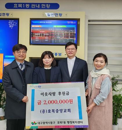 효목1동에 소재한 효목중앙교회는 지난 23일, 지역 내 어려운 이웃을 위한 성금 200만원을 효목1동 행정복지센터에 전달했다.