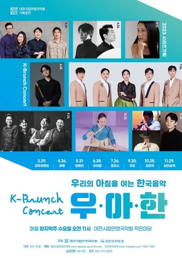 우리 지역 전통음악 인프라 확충과 국악의 대중화, 생활화를 위해대전국악방송과 공동으로 추진 중인 K-브런치콘서트 '우·아·한'은 국내외에서 활발하게 활동하고 있는 연주자들과 함께 클래식, 재즈 등 다양한 장르의 경계를 넘나들며 국악 중심 동시대 최고의 한국창작음악을 선사한다.