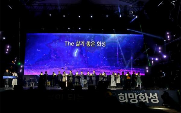 이날 행사는 식전공연으로 이은미, 이찬원의 축하공연에 이어 100만 도시 선포 불꽃 드론쇼에서 형형색색의 조명장비가 탑재된 드론 300대가 화성시의 100만을 축하하는 다양한 형상을 그려냈다. 이어진 축하무대로 라포엠, 에일리, 윤도현 밴드 공연이 한파를 무색하게 할 정도로 시민들의 열띤 호응을 이끌어냈고 달을 형상화한 조형물이 오색빛의 분수와 어우러지는 ‘루나쇼’가 밤 하늘을 수놓으며 하이라이트를 장식했다.