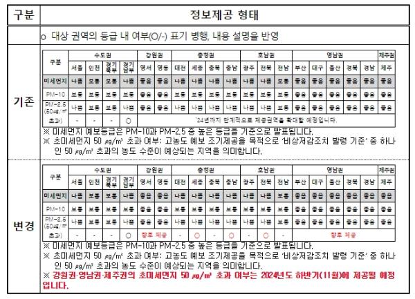국립환경과학원은 대상 권역 단계별 확대 계획*에 따라 오는 11월 27일 17시 예보부터 수도권에서 충청권, 호남권까지 확대한 예측 정보를 제공할 예정이며 강원권, 영남권, 제주권은 2024년 11월에 제공될 계획이다.