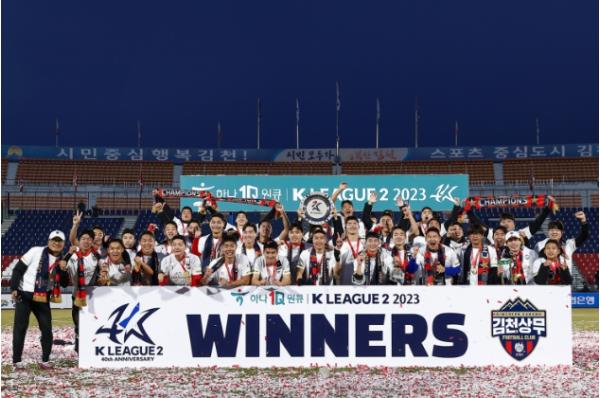 김천은 지난 11일 경남 원정에서 1대 1 무승부를 기록하며 자력 우승이 불발됐다. 26일 마지막 경기에서 승리한 후 부산의 결과를 지켜봐야 했다. 26일 김천은 이랜드를 꺾고 승점 3점을 챙긴 반면 부산은 청주에 무승부를 기록하며 김천은 K리그2 역전 우승을 차지했다. 이로서 김천은 2021년 K리그2 우승 이후 2023년 다시 한 번 우승컵을 들어 올린 주인공이 됐다. 동시에 김천은 2022년 강등 이후 1년 만에 다시 K리그1에 복귀했다.