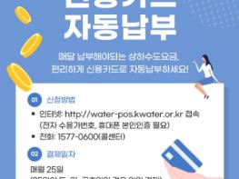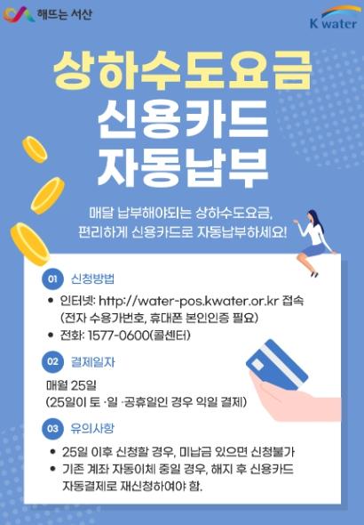 충남 서산시와 한국수자원공사 서산권지사는 오는 12월 1일부터 상하수도요금 신용카드 자동납부 서비스를 시행한다고 밝혔다.