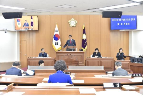 제 1차 본회의에서 총 33건의 안건을 처리했다. 이중 의원발의 안건으로는 ▲서울특별시 양천구 청년 문화예술 육성 및 지원 조례안 ▲서울특별시 양천구 민주평화통일자문회의 양천구협의회 지원에 관한 조례안 ▲서울특별시 양천구 초등학생 생존수영교육 지원 조례안 ▲서울특별시 양천구 가사근로자의 고용개선 및 지원에 관한 조례안 ▲서울특별시 양천구 진로교육 활성화 지원 조례 전부개정조례안 ▲서울특별시 양천구 골목형상점가 활성화 지원 조례 일부개정조례안 ▲서울특별시 양천구 가족돌봄청년 지원에 관한 조례안 ▲서울특별시 양천구 청소년 기본 조례안 ▲서울특별시 양천구 공영장례 조례안 ▲서울특별시 양천구 아동?청소년복지시설 퇴소청소년 등의 지원에 관한 조례 전부개정조례안 ▲서울특별시 양천구 중증장애인 자립생활 지원 조례 일부개정조례안 ▲서울특별시 양천구 개인하수처리시설의 청소 및 분뇨의 처리에 관한 조례 일부개정조례안 ▲서울특별시 양천구 주차장 설치 및 관리 조례 일부개정조례안 ▲서울특별시 양천구 공항소음대책지역 주민 지원에 관한 조례 일부개정조례안 ▲서울특별시 양천구 한부모가족 지원에 관한 조례 일부개정조례안 등 15건이 원안 가결됐다.