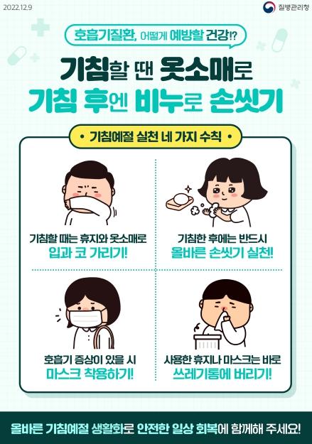 호흡기감염병 예방을 위해서는 손씻기의 생활화, 기침예절 지키기, 씻지 않은 손으로 눈, 코, 입 만지지 않기 등 개인위생 수칙 준수가 중요하다.