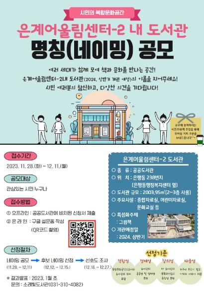 시흥시는 2024년 상반기에 개관 예정인 은계어울림센터-2 내 공공도서관의 명칭을 공모한다.