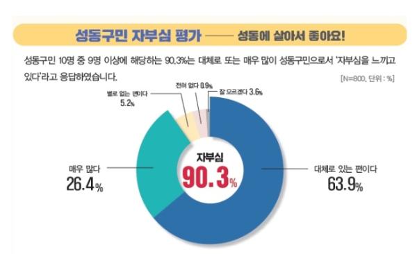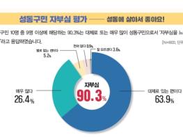보다 직접적인 지표인 구정 효능감에 대해서는 ‘내 생활 속에 불편함이 생겼을 때, 언제든 성동구청에 이야기하면 해결할 수 있다’에 응답자의 절반 이상인 51.5%가 ‘동의한다’고 답했다. 또 ‘성동구민으로서 자부심이 있다’라는 문항에 90.3%가 긍정적으로 응답해 높은 효능감에 이어 높은 성동구민으로서의 자부심도 확인됐다.