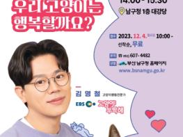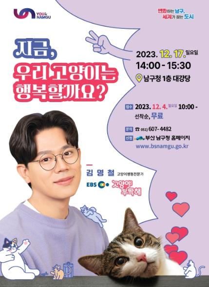 부산 남구는 12월 17일 오후2시 남구청 1층 대강당에서 고양이행동전문가 김명철 수의사를 초청하여 반려묘 특강을 진행한다.