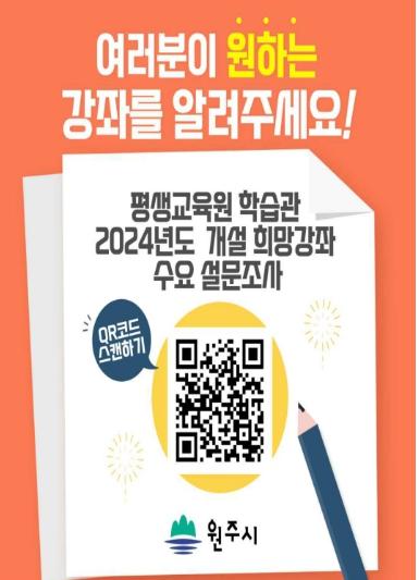원주시 평생교육원 학습관은 2024년도 정규강좌 구성을 위해 개설희망 강좌 수요 설문조사를 실시한다.
