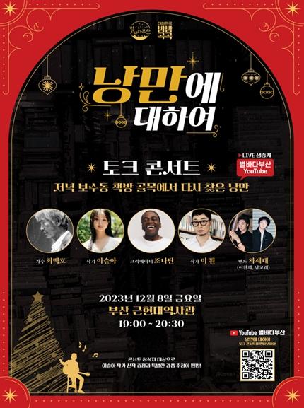 부산시는 부산관광공사와 오는 12월 8일 오후 7시 부산근현대역사관 별관에서 야간 토크 콘서트 '낭만에 대하여'를 개최한다고 밝혔다.