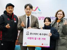 충남 서산시는 지난 28일 몬스터FC 축구센터에서 어려운 이웃을 위한 사랑의 쌀 1톤과 이웃돕기 성금 1백만 원을 기탁했다고 밝혔다.