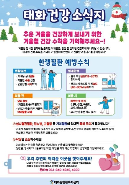 이번 「태화 건강 소식지」는 지난 봄철 환절기 건강관리법, 여름철 폭염 대비 건강관리법에 이어 겨울철 한파에 대비하여 다양한 건강 정보를 담았다. 까치소식과 함께 주민들에게 배부되어 계절별 특성에 따른 건강관리법을 공유함으로써 건강수명을 연장하고 사전 예방관리를 통해 삶의 질 향상을 도모한다.