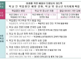 동 방안은 ▲학업중단 예방, ▲학교 밖 청소년 지원, ▲협업 · 데이터 기반 강화의 3대 부문 6대 핵심과제로 구성되며, 과제별 주요 내용은 다음과 같다.