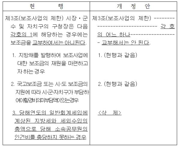 '지방자치단체의 교육경비 보조에 관한 규정' 일부개정령안 개정(2023.11.28. 공포?시행 예정)으로 해당년도 자체수입(지방세와 세외수입)으로 소속 공무원의 인건비를 충당하지 못하는 일부 시?군?자치구는 관할 소재지의 고등학교 이하 각급학교에 교육경비를 보조할 수 없도록 하는 제한 규정이 삭제됐다.