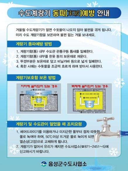 조병옥 음성군수는 “매년 반복되는 동파 피해는 조금만 관심을 기울이면 예방할 수 있다”며 “군민들이 동절기 상수도 동파로 인한 불편을 겪지 않도록 동파 사고에 신속히 대응하는 등 피해 최소화를 위해 최선을 다하겠다”고 말했다.