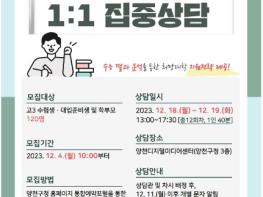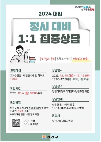 양천구는 12월 18일과 19일 양일간 양천디지털미디어센터에서 대입 준비생과 학부모 120명을 대상으로 ‘2024 정시대비 1:1 집중상담’을 운영하고, 12월 4일 오전 10시부터 선착순 접수를 시작한다고 밝혔다.