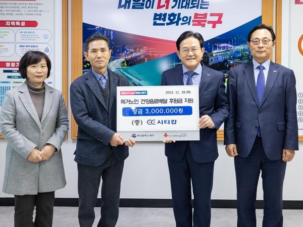 부산 북구는 지난 28일, ㈜시티캅(대표이사 정현돈)이 북구청을 찾아 독거노인 사랑의 건강음료 배달사업 후원금으로 300만원을 기탁했다고 밝혔다.