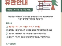 예산군립도서관은 군립도서관 증축 및 리모델링 공사 준공에 따른 재개관 준비를 위해 오는 12월 4일부터 2024년 1월 22일까지 약 7주간 임시자료실을 휴관한다고 밝혔다.