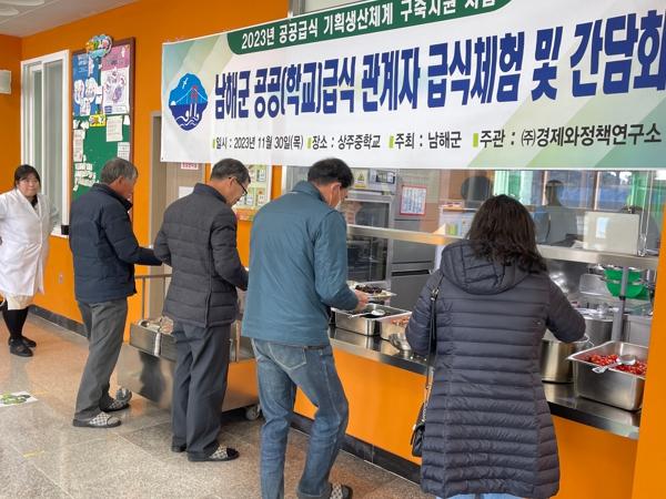 남해군은 30일 상주중학교에서 기획생산체계 구축을 위한 관계자 간 소통을 목적으로 남해군먹거리생산자회, 남해교육지원청, 학교 관계자 등 13명이 참석한 가운데 급식 체험 및 관계자 간담회를 실시했다.