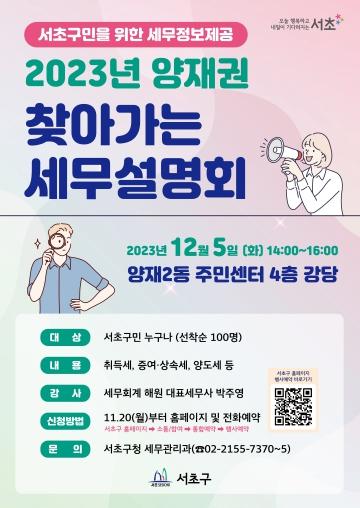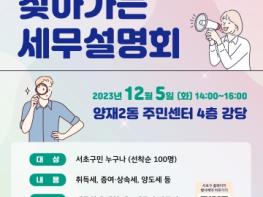 서울 서초구는 오는 5일 복잡한 세법에 대해 구민들의 궁금증 해소하는 ‘2023년 양재권, 찾아가는 세무설명회’를 연다,