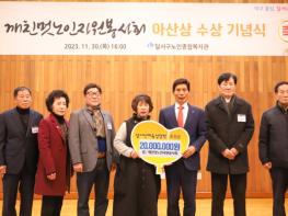 대구 달서구는 11월 30일 달서구노인종합복지관에서 지난 11월 23일 아산상을 수상한 깨친멋노인자원봉사회의 기념 축하연을 개최하며 봉사회에서 상금 2,000만원 전액을 달서인재육성장학재단에 후원하는 전달식도 진행했다.