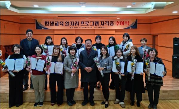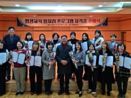 이번 과정은 미술심리치료사, 하브루타 지도자, 전래놀이 지도사, 보드게임 및 창의수학 지도사 전문자격증 과정으로 수료생들의 95%이상이 자격증 취득에 합격하여 11월 30일 교육문화회관에서 자격증 수여식을 했다.