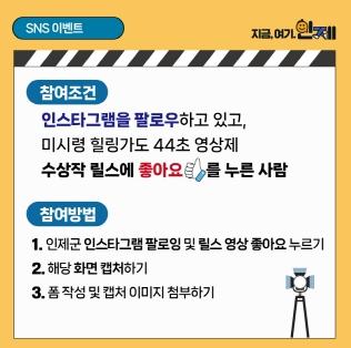 이번 공모전 수상작은 유튜브, 인스타그램 등 인제군 공식 SNS를 통해 만나볼 수 있다. 12월 1일부 8일까지 진행되는 인제군 인스타그램 ‘좋아요 이벤트’에 참여하면 추첨을 통해 총200명에게 5천원 상당 커피 기프티콘을 제공한다.