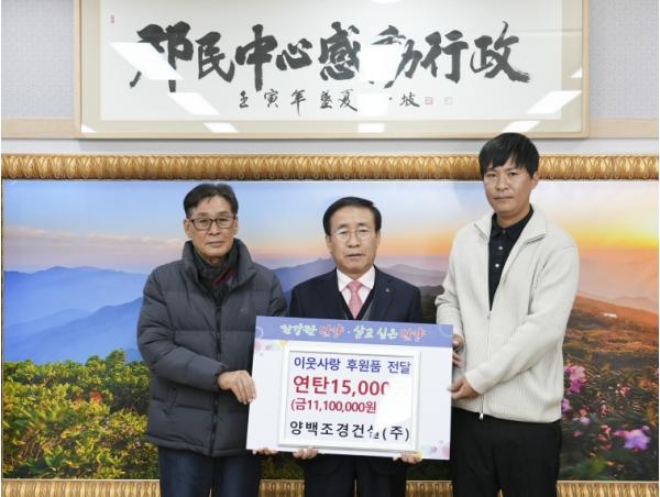 이번에 기탁된 연탄은 1,110만 원 상당으로 양백조경건설은 매년 관내 취약계층 및 위기가구를 위한 성금과 물품을 지속해서 기탁하며 지역 사회 공헌을 활발히 이어가고 있다.
