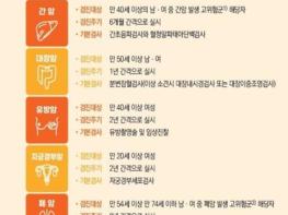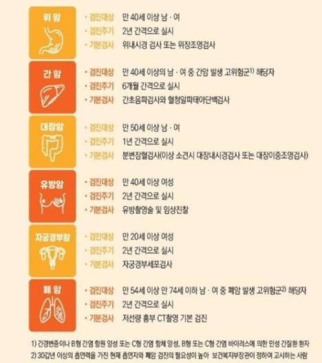 암의 종류별 검진 대상은 ▲위암 40세 이상 ▲간암 40세 이상 중 고위험군 ▲대장암 50세 이상 ▲유방암 40세 이상 여성 ▲자궁경부암 20세 이상 여성 ▲폐암 54~74세 중 고위험군이다.
