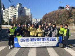 기습폭설로 인한 교통사고 상황을 가정한 이날 훈련에서는 제설차, 경찰차, 견인차 등 13대의 장비와 50여 명의 인력이 참여해 사고 현장 교통통제, 사고 차량 운전자 구조, 차량 견인, 제설작업 등을 실시했다.