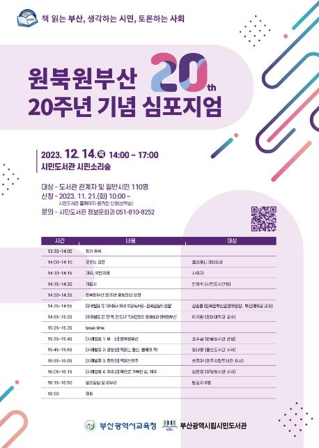 부산광역시립시민도서관은 원북원부산 20주년을 기념해 12월 14일 오후 2시부터 도서관 시민소리숲에서 도서관 관계자와 시민 110명을 대상으로 ‘원북원부산 20주년 기념 심포지엄’을 개최한다.