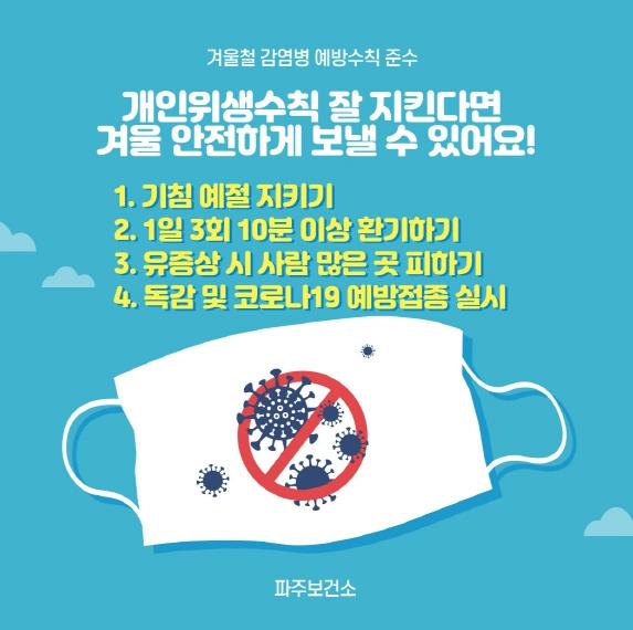 파주시는 최근 추워진 날씨와 실내 활동 증가에 따라 폐렴, 독감, 노로바이러스 등 감염병 예방을 위한 방역수칙을 준수해 줄 것을 당부했다.