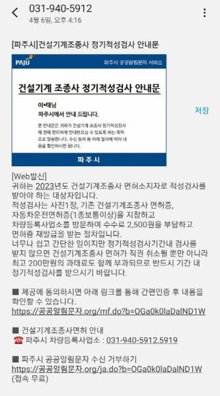 파주시는 건설기계 조종사면허 적성검사 대상자에게 검사 기간(2023년 12월 31일)내 적성검사를 받을 것을 당부하는 공공알림문자를 12월 5일에 발송할 예정이다. 이번 공공알림문자는 올 들어 4번째이자 마지막 문자다.