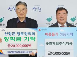 산청군은 창원시에 위치하고 있는 ㈜송림개발이 이웃돕기 성금(1000만원)과 향토장학금(2000만원) 등 총 3000만원을 기탁했다고 4일 밝혔다.