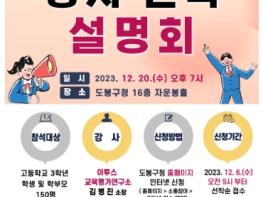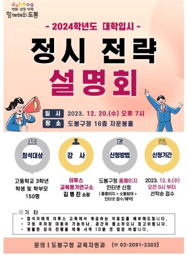 도봉구가 오는 12월 20일 오후 7시 도봉구청 16층 자운봉홀에서 수험생과 학부모들을 대상으로 2024학년도 대학입시 '정시 전략 설명회'를 개최한다.