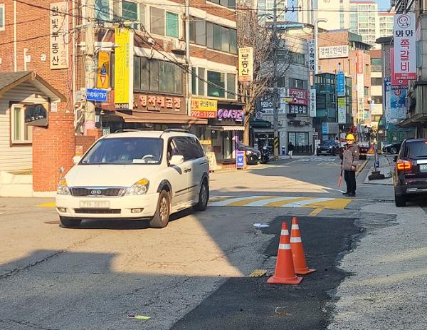 이곳은 창5동 상아2차아파트 앞 노해로63가길이다. 창동초등학교와 1?4호선 창동역을 연결하는 주요 길목으로 지난 10여 년간 상습 정체와 교통사고가 일어났던 곳이다.