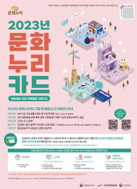 기초생활수급자 및 차상위계층의 문화향유 기회 확대를 위해 발급되는 문화누리카드는 개인당 11만원이 지원된다. 2023년 지원금은 12월 31일까지만 사용할 수 있다. 특히 기한 내 사용하지 않은 지원금은 이월되지 않고 전부 소멸되므로 이용자의 각별한 주의가 필요하다.