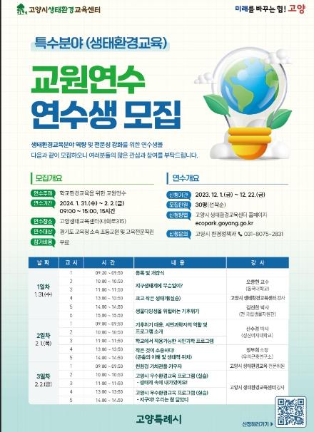 고양특례시 생태환경교육센터가 환경 교육이 의무화됨에 따라 생태환경교육 교원연수 과정을 2024년 1월 31일부터 2월 2일까지 운영한다.