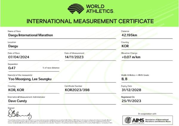 대구광역시는 12월 4일 세계육상연맹(WA)으로부터 2024대구마라톤대회 코스의 기록을 세계기록으로 인정하는 ‘국제공인코스 인증서’를 받았다.