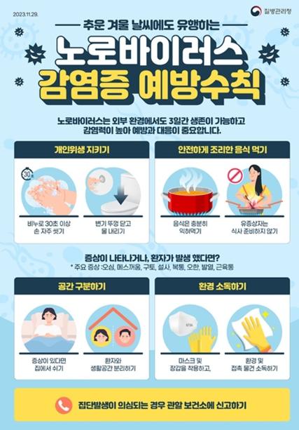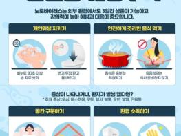 예방법으로는 △손을 씻을 때 비누를 사용해 흐르는 물에 30초 이상 손가락, 손등까지 깨끗하게 씻기 △어패류는 85℃이상에서 1분 이상 충분히 익혀 먹기 △노로바이러스 오염 가능성이 있는 지하수는 반드시 끓여 먹기 △칼·도마는 육류, 생선, 채소 등 식재료에 따라 구분해 사용하고 조리 기구는 열탕 소독하거나 기구 등의 살균 소독제로 소독 후 세척하기 △구토·설사 등 의심 증상이 있는 사람은 조리에 참여하지 않도록 하고, 증상이 회복된 후에도 2~3일 동안은 조리에서 배제하기 등이다.