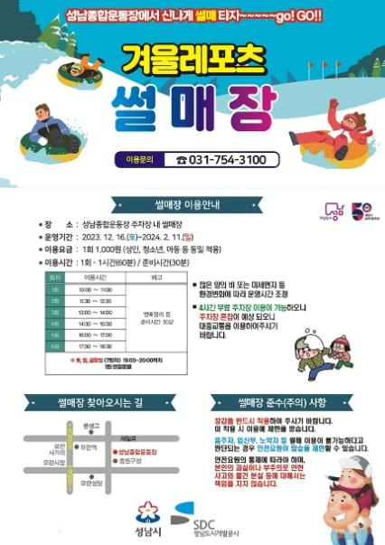 눈썰매장은 성남종합운동장 야외주차장에 각각 8레인의 일반용 슬로프(폭 13m, 길이 45m)와 유아용 슬로프(폭 13m, 길이 30m)를 조성했다.