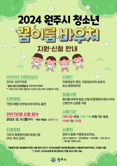 원주시는 12월 11일부터 내년 초등학교 입학을 앞둔 2017년생을 대상으로 원주시 청소년 꿈이룸 바우처 지원사업 신청을 받는다.