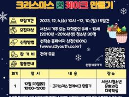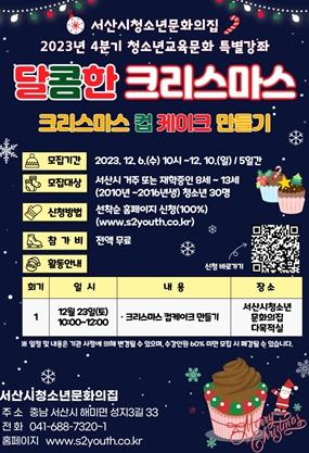 서산시청소년문화의집은 오는 6일부터 지역 청소년 30명을 대상으로 2023년 4분기 청소년교육문화 특별강좌 “달콤한 크리스마스” 참가 청소년을 모집한다고 밝혔다.