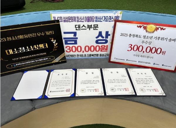 음성군 대소청소년센터가 2023년도 활동·안전·지도자 부문 등 다방면에서 수상하고 청소년수련시설종합평가에서도 우수한 성적(백분위 중 94.8점)을 달성했다.