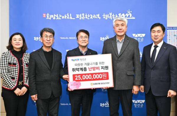 [제호 NH농협은행 정선군지부(지부장 박종범)는 지난 6일 정선군에, 연말을 맞이하여 관내 어려운 이웃에게 온기를 나누기 위한 난방비 2,500만원을 전달했다. 전달된 난방비는 군 복지과를 통해 지역 내 고령 농업인과 취약계층 250명에게 지원되어 따뜻한 겨울나기에 보탬이 될 계획이다.
