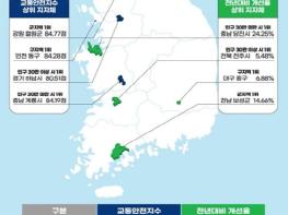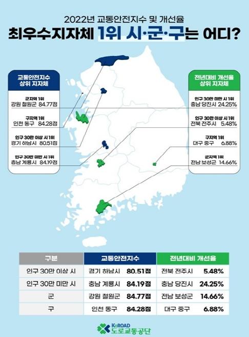 도로교통공단(이사장 이주민)에서 2022년도 교통안전지수를 분석한 결과 전년 대비 교통안전지수가 향상된 지역은 당진시, 보성군, 대구 중구, 전주시로 나타났다. 특히, 당진시는 교통약자 등 6개 모든 영역에서 크게 개선되며 전년 대비 24.25%의 높은 개선율을 보였다.