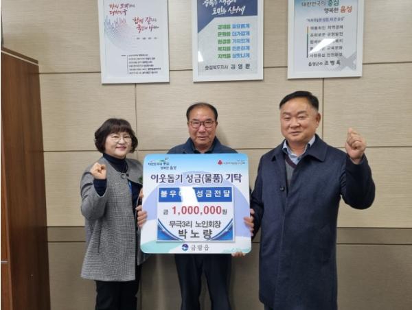 음성군 금왕읍 무극3리 박노량 노인회장은 지난 7일 금왕읍 행정복지센터를 방문해 어려운 이웃을 위해 사용해 달라며 100만원을 기탁했다.