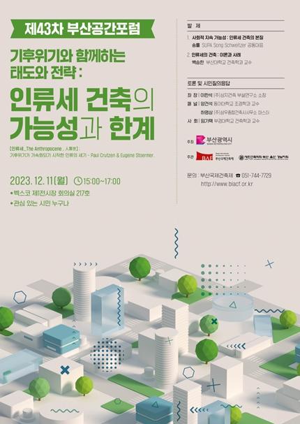 부산시는 오는 12월 11일 오후 3시 벡스코 제1전시장 2층 회의실에서 '제43차 부산공간포럼'을 개최한다고 밝혔다.