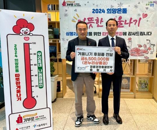 중랑구 상봉2동은 지난 7일 국민체육진흥공단 경륜경정총괄본부 중랑지점으로부터 ‘희망온돌 따뜻한 겨울나기’ 후원금으로 650만 원 상당의 온누리상품권을 전달받았다.